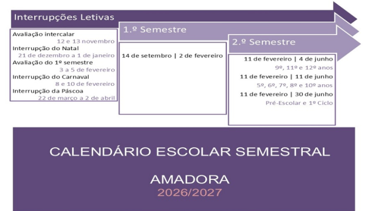 O calendário para o ano letivo 2026-2027 já está definido, tendo sido aprovado em reunião do Conselho de Diretores, no passado mês de Março. O arranque acontece no dia 14 de Setembro de 2026 e mantém o modelo semestral.As datas de início e fim dos semestres também já são conhecidas: o primeiro termina a 2 de Fevereiro; o segundo semestre começa a 11 de Fevereiro e para o 9º, 11º e 12º termina a 4 de Junho, para o 5º, 6, 7º, 8º e 10º vai até ao dia 11 de Junho e o pré-escolar e primeiro ciclo fecha a 30 de Junho.As interrupções do Carnaval acontecem de 8 a 10 de Fevereiro e a da Páscoa de 22 de Março a 2 de Abril. Imagem: CM Amadora